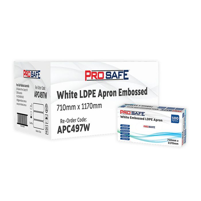 ProSafe LDPE Embossed Aprons are lightweight and comfortable with 2 back ties and a PE poly Barrier, Suitable for general purpose protection.