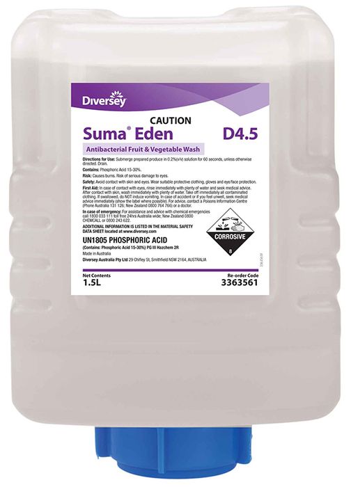 This Diversey™ Suma® Eden D4.5 Antibacterial Vegetable Washer is formulated to remove surface soil, a broad range of bacteria, pesticides and waxes from fruit and vegetable. It is designed to use with the Eden dispensing unit.