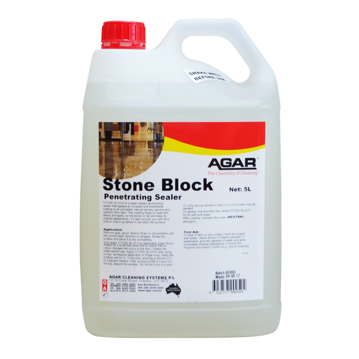 STONE BLOCK finds application in bathrooms, kitchens, shopping centres, building facades, balconies, paved areas and hotel foyers. NOTE: STONE BLOCK is designed for use on stone surfaces with fine pores. Stones or tiles with large visible pores, gas bubbles, or crevices may trap dirt in these cavities. STONE BLOCK will not fill up such holes, large pores or crevices. Please ask your Agar Representative to advise you on the best product for such surfaces, including extremely porous sandstone and bluestone.