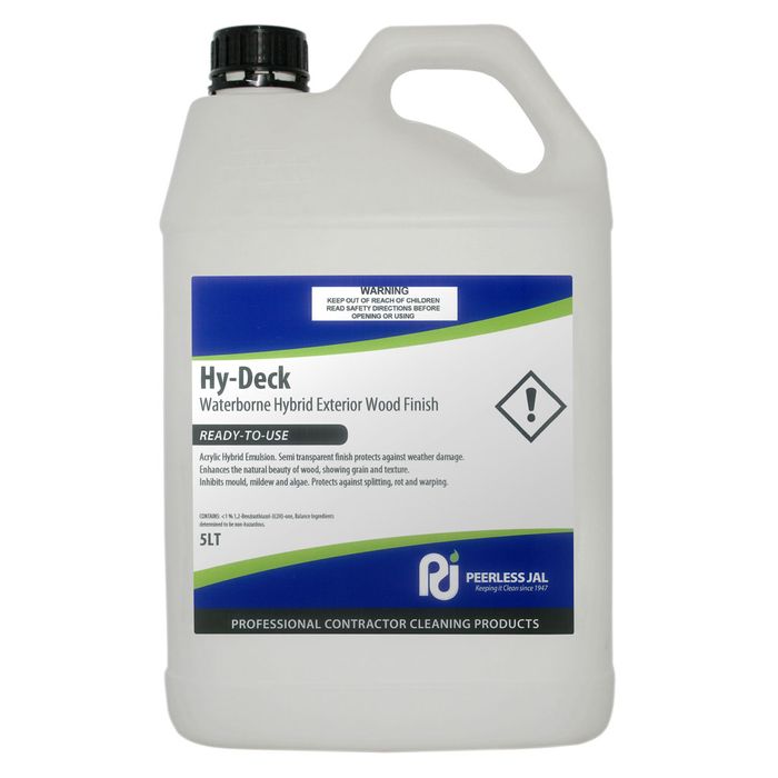 Hy-Deck is a water-based acrylic hybrid emulsion low film finish for exterior wood and is ideal for coating garden decks, verandas, piers and other garden structures. It has a special wax enriched formula, which repels water and provides excellent protection against water damage such as splitting, rot and warping caused by water absorption. Hy-Deck has effective antibacterial properties and will inhibit mould, mildew and algae.