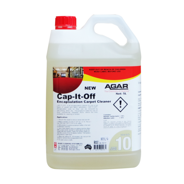Introducing CAP-IT-OFF - the revolutionary encapsulation cleaner for all types of carpets and washable fabric upholstery. With its specially formulated ingredients, CAP-IT-OFF is designed to leave your carpets spotless and prevent rapid resoiling.