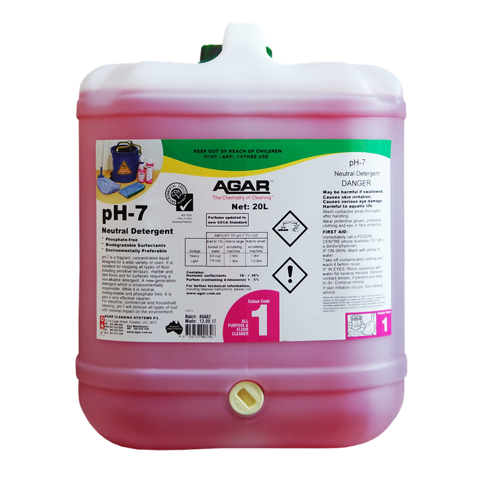 pH-7 will remove all soil and spillages including foodstuffs, drinks, cooking oil and general traffic dirt from all types of floors and other surfaces. It is recommended for use on alkali-sensitive surfaces such as terrazzo, marble or ceramic tiles. No rinsing is required.