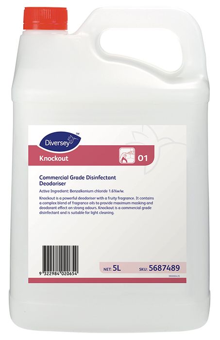 The Diversey™ Knockout deodoriser disinfectant is a powerful deodorizer with 'fruity' fragrance, Knockout is a complex blend of essential oils balanced to provide maximum masking and deodorant effect on strong odors. Combined with this high level of masking. Knockout is suitable for light cleaning and disinfecting.