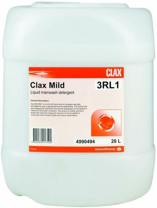 Excellent performance on a wide range of stains and types of soils Prevents greying of linen; stabilisation of soil particles in the wash liquor Very effective on proteinaceous soil (eg. blood and food stains) Suitable for washing delicates and coloureds. Clax Mild 3RL1 is a fully built liquid laundry detergent specially formulated for use in specialised laundry applications. Clax Mild 3RL1 is an enzymated detergent designed for automatic and manual dosing and can be applied in medium to hard water conditions. This product is ideally suited as a single shot main wash detergent, however may be used in conjunction with an alkali booster for heavily soiled fabric.