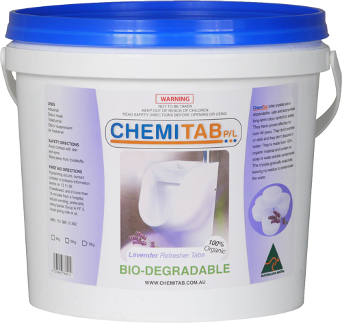 Scented Refresher Tabs: Dependable, safe and economical long term odour control for toilets. Chemitab toilet deodorant blocks (crystals) are made from 100% organic material and contain no soap or water soluble components. The crystals gradually evaporate, leaving no residue to contaminate the water. Para dichlorobenzene (PDCB) deodorant blocks are a non-regulated product for transport and storage. PDCB has a short half-life in the atmosphere and is considered readily biodegradable. Recent international studies of the effects of PDCB have concluded that it poses little threat to the environment or to human health when used as intended.