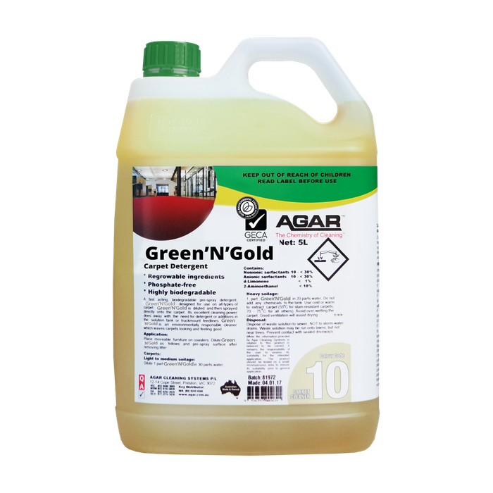 GREEN’N’GOLD Carpet Detergent is an environmentally preferable detergent for cleaning carpets by hot water extraction. It contains fast-acting cleaning agents and is pH controlled to be safe to use on 100% wool carpets, nylons and all washable synthetic fibres.