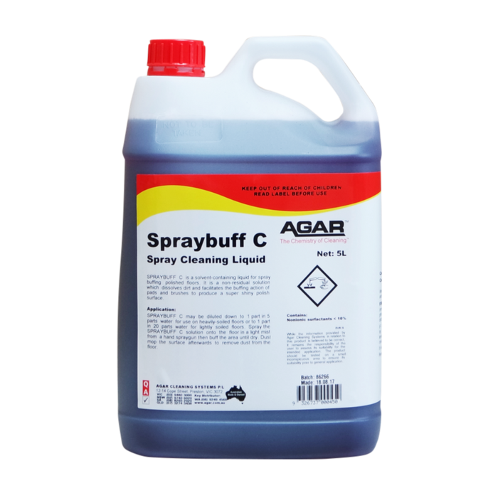 SPRAYBUFF C is a water-based liquid for spraybuffing polished floors. It is a non-residual solution which dissolves all commonly encountered floor spillages and facilitates the buffing action of pads and brushes in producing a super shiny polish surface.
