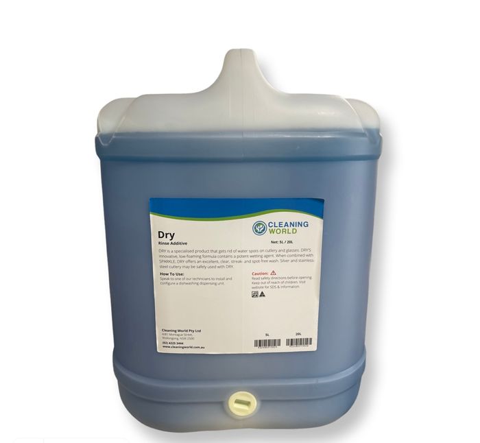 Say goodbye to water spots on your cutlery and glasses with Cleaning World Dry Rinse Aid! Our specialised formula is designed to eliminate unsightly water spots and leave your dishes sparkling clean and crystal clear. DRY's innovative lowfoaming formula contains a potent wetting agent that works in harmony with our SPARKLE wash to provide you with an unbeatable, streak- and spot-free clean. Plus, you can rest easy knowing that your silver and stainless-steel cutlery are safe to use with DRY.